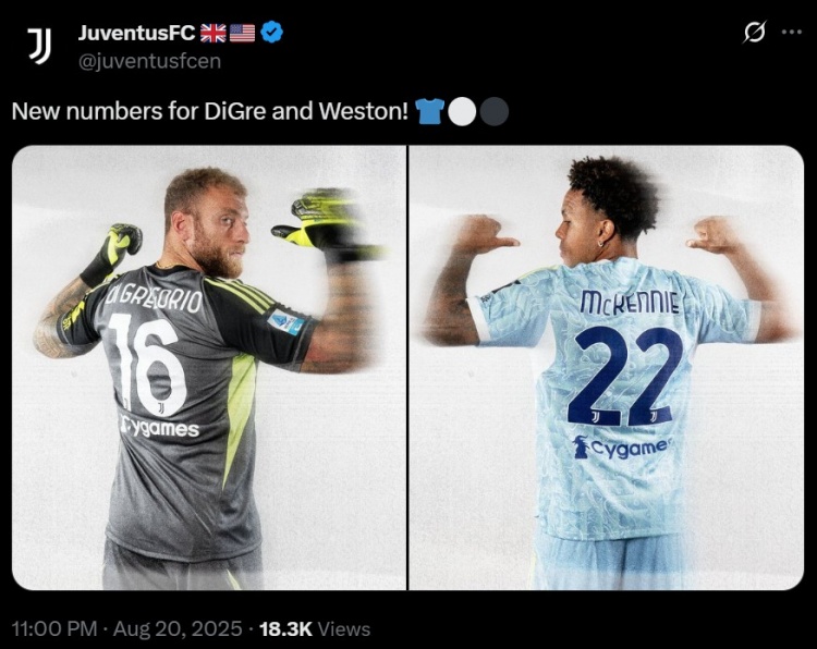 8月21日尤文图斯官方宣布,球队两名球员完成号码变更。